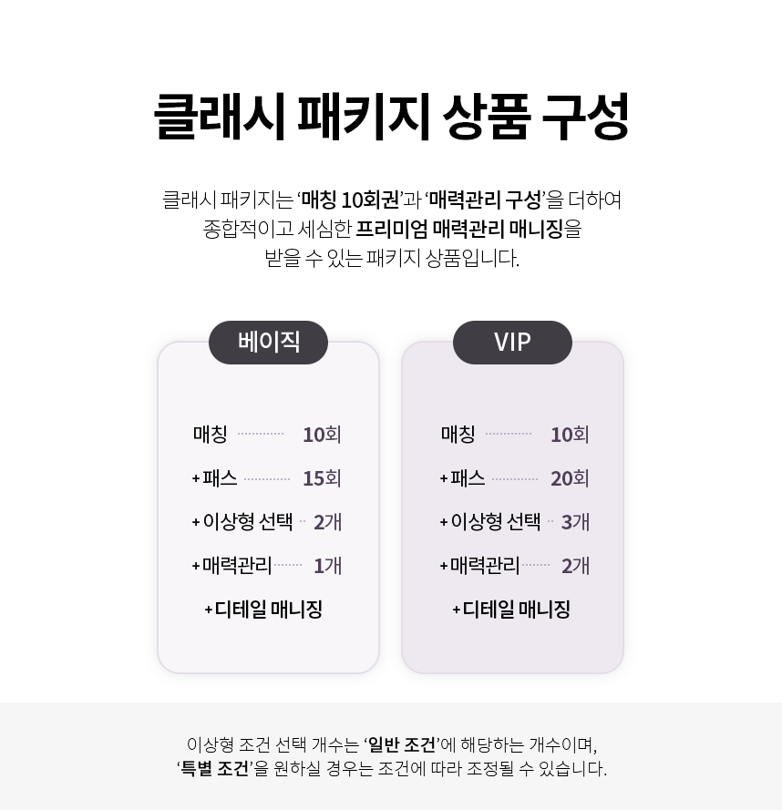 - 이용금액은 매칭비(탐색 및 매칭 시도, 상대 프로필 수령, 만남 주선 및 일정 조율, 컨설팅) 으로 구성됩니다.