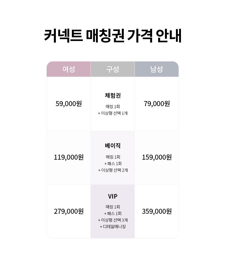 - 이용금액은 매칭비(탐색 및 매칭 시도, 상대 프로필 수령, 만남 주선 및 일정 조율, 컨설팅) 으로 구성됩니다.